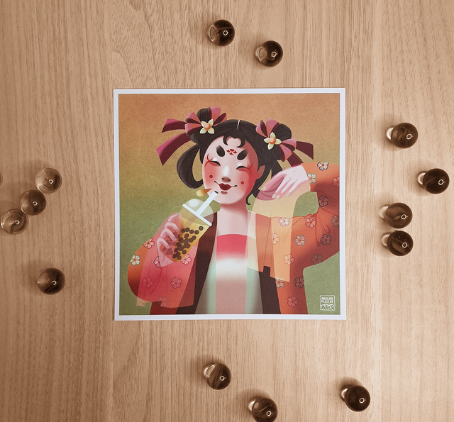 Tryptique anachronique de courtisanes chinoises avec bubble tea. Disponible en goût taro, framboise ou pêche, 20x20cm ou 15x15cm, papier recyclé.