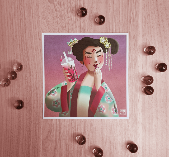 Anachronistic triptych of Chinese courtesans with bubble tea. Available in taro, raspberry or peach flavour, 7.8x7.8 in or 5.9x5.9 in on 300 g/m² recycled paper .