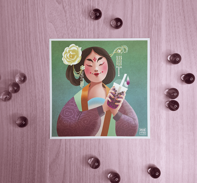 Anachronistic triptych of Chinese courtesans with bubble tea. Available in taro, raspberry or peach flavour, 7.8x7.8 in or 5.9x5.9 in on 300 g/m² recycled paper .